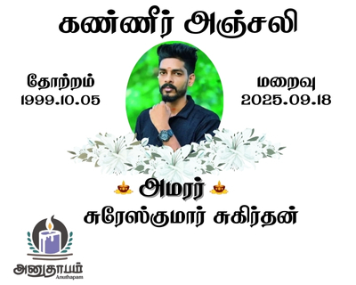 Closed (6 Reviews) அமரர் சுரேஸ்குமார் சுகிர்தன் மலர்வு 1999.10.05 உதிர்வு 2025.09.18 kilinochchi கண்ணீர் அஞ்சலி