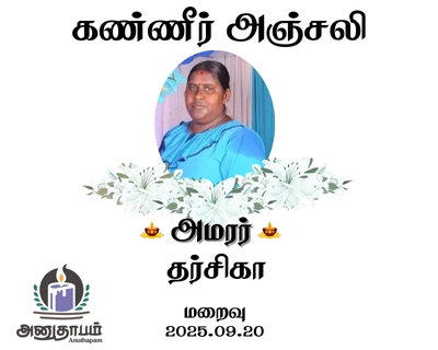 Closed (3 Reviews) அமரர் சுந்தர்லிங்கம் சரோஜினிதேவி மலர்வு 1950.05.22 உதிர்வு 2025.10.07 kilinochchi கண்ணீர் அஞ்சலி