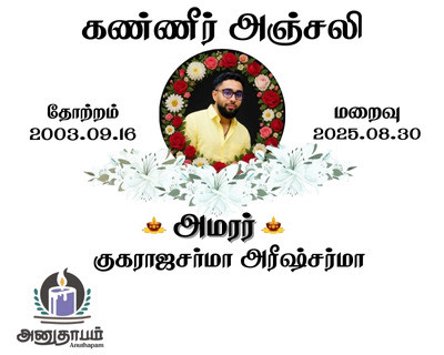 Closed (1 Review) அமரர் குகராஜா அரிஷ்சர்மா மலர்வு 2003.09.16 உதிர்வு 2025.08.30 Zürich கண்ணீர் அஞ்சலி