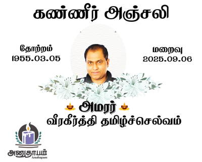 Closed (1 Review) அமரர் வீரகீர்த்தி தமிழ்ச்செல்வம் மலர்வு 1955.03.05 உதிர்வு 2025.09.06 Zürich கண்ணீர் அஞ்சலி