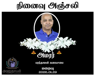 அமரர் பரந்தாமன் கனகசபை 29.02.2026 Share Post Facebook Twitter LinkedIn Pinterest Save Submit Review உங்கள் இரங்கலை தெரிவிக்க - “அமரர் பரந்தாமன் கனகசபை” Cancel reply அனுதாபம் துக்கம் கருணை பச்சாத்தாபம் Save my name, email, and website in this browser for the next time I comment. Drop images to upload or Gallery Images உங்கள் இரங்கலை தெரிவிக்க - “அமரர் பரந்தாமன் கனகசபை” Cancel reply அனுதாபம் துக்கம் கருணை பச்சாத்தாபம் Save my name, email, and website in this browser for the next time I comment. Drop images to upload or Gallery Images
