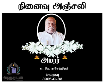 அமரர் எ. கே. ராசேந்திரன் மறைவு 26.01.2026 Share Post Facebook Twitter LinkedIn Pinterest Save Submit Review உங்கள் இரங்கலை தெரிவிக்க - “அமரர் எ. கே. ராசேந்திரன்” Cancel reply அனுதாபம் துக்கம் கருணை பச்சாத்தாபம் Save my name, email, and website in this browser for the next time I comment. Drop images to upload or Gallery Images உங்கள் இரங்கலை தெரிவிக்க - “அமரர் எ. கே. ராசேந்திரன்” Cancel reply அனுதாபம் துக்கம் கருணை பச்சாத்தாபம் Save my name, email, and website in this browser for the next time I comment. Drop images to upload or Gallery Images