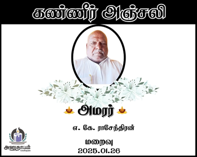 அமரர் எ. கே. ராசேந்திரன் மறைவு 26.01.2026 Share Post Facebook Twitter LinkedIn Pinterest Save Submit Review உங்கள் இரங்கலை தெரிவிக்க - “அமரர் எ. கே. ராசேந்திரன்” Cancel reply அனுதாபம் துக்கம் கருணை பச்சாத்தாபம் Save my name, email, and website in this browser for the next time I comment. Drop images to upload or Gallery Images உங்கள் இரங்கலை தெரிவிக்க - “அமரர் எ. கே. ராசேந்திரன்” Cancel reply அனுதாபம் துக்கம் கருணை பச்சாத்தாபம் Save my name, email, and website in this browser for the next time I comment. Drop images to upload or Gallery Images