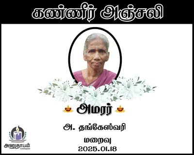 அமரர் அ. தங்கேஸ்வரி மறைவு 18.01.2026 Jaffna Share Post Facebook Twitter LinkedIn Pinterest Save Submit Review உங்கள் இரங்கலை தெரிவிக்க - “அமரர் அ. தங்கேஸ்வரி” Cancel reply அனுதாபம் துக்கம் கருணை பச்சாத்தாபம் Save my name, email, and website in this browser for the next time I comment. Drop images to upload or Gallery Images உங்கள் இரங்கலை தெரிவிக்க - “அமரர் அ. தங்கேஸ்வரி” Cancel reply அனுதாபம் துக்கம் கருணை பச்சாத்தாபம் Save my name, email, and website in this browser for the next time I comment. Drop images to upload or Gallery Images