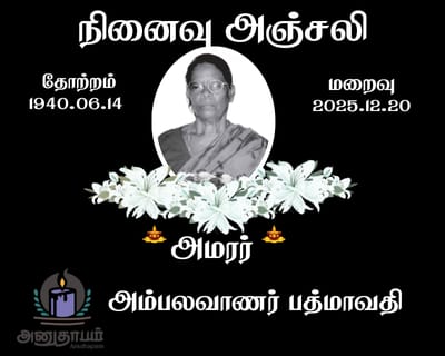 அமரர் அம்பலவாணர் பத்மாவதி 20.12.2025 Jaffna Share Post Facebook Twitter LinkedIn Pinterest Save Submit Review உங்கள் இரங்கலை தெரிவிக்க - “அமரர் அம்பலவாணர் பத்மாவதி” Cancel reply அனுதாபம் துக்கம் கருணை பச்சாத்தாபம் Save my name, email, and website in this browser for the next time I comment. Drop images to upload or Gallery Images உங்கள் இரங்கலை தெரிவிக்க - “அமரர் அம்பலவாணர் பத்மாவதி” Cancel reply அனுதாபம் துக்கம் கருணை பச்சாத்தாபம் Save my name, email, and website in this browser for the next time I comment. Drop images to upload or Gallery Images