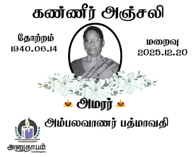 அமரர் அம்பலவாணர் பத்மாவதி தோற்றம் 14.06.1940 மறைவு 20.12.2025 Jaffna Share Post Facebook Twitter LinkedIn Pinterest Save Submit Review உங்கள் இரங்கலை தெரிவிக்க - “அமரர் அம்பலவாணர் பத்மாவதி” Cancel reply அனுதாபம் துக்கம் கருணை பச்சாத்தாபம் Save my name, email, and website in this browser for the next time I comment. Drop images to upload or Gallery Images உங்கள் இரங்கலை தெரிவிக்க - “அமரர் அம்பலவாணர் பத்மாவதி” Cancel reply அனுதாபம் துக்கம் கருணை பச்சாத்தாபம் Save my name, email, and website in this browser for the next time I comment. Drop images to upload or Gallery Images