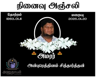 அமரர் அன்புரெத்தினம் சித்தார்த்தன் 20.02.2026 Share Post Facebook Twitter LinkedIn Pinterest Save Submit Review உங்கள் இரங்கலை தெரிவிக்க - “அமரர் அன்புரெத்தினம் சித்தார்த்தன்” Cancel reply அனுதாபம் துக்கம் கருணை பச்சாத்தாபம் Save my name, email, and website in this browser for the next time I comment. Drop images to upload or Gallery Images உங்கள் இரங்கலை தெரிவிக்க - “அமரர் அன்புரெத்தினம் சித்தார்த்தன்” Cancel reply அனுதாபம் துக்கம் கருணை பச்சாத்தாபம் Save my name, email, and website in this browser for the next time I comment. Drop images to upload or Gallery Images