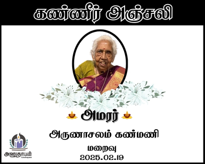 அமரர் அருணாசலம் கண்மணி மறைவு 19.02.2026 Jaffna Share Post Facebook Twitter LinkedIn Pinterest Save Submit Review உங்கள் இரங்கலை தெரிவிக்க - “அமரர் அருணாசலம் கண்மணி” Cancel reply அனுதாபம் துக்கம் கருணை பச்சாத்தாபம் Save my name, email, and website in this browser for the next time I comment. Drop images to upload or Gallery Images உங்கள் இரங்கலை தெரிவிக்க - “அமரர் அருணாசலம் கண்மணி” Cancel reply அனுதாபம் துக்கம் கருணை பச்சாத்தாபம் Save my name, email, and website in this browser for the next time I comment. Drop images to upload or Gallery Images