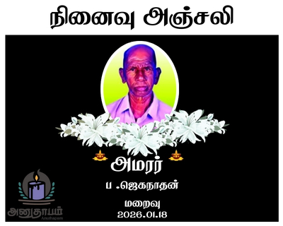 அமரர் ப .ஜெகநாதன் 18.02.2026 Share Post Facebook Twitter LinkedIn Pinterest Save Submit Review உங்கள் இரங்கலை தெரிவிக்க - “அமரர் ப .ஜெகநாதன்” Cancel reply அனுதாபம் துக்கம் கருணை பச்சாத்தாபம் Save my name, email, and website in this browser for the next time I comment. Drop images to upload or Gallery Images உங்கள் இரங்கலை தெரிவிக்க - “அமரர் ப .ஜெகநாதன்” Cancel reply அனுதாபம் துக்கம் கருணை பச்சாத்தாபம் Save my name, email, and website in this browser for the next time I comment. Drop images to upload or Gallery Images