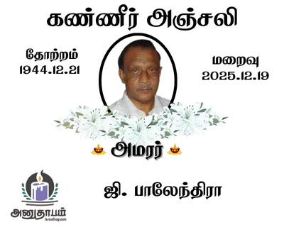 அமரர் ஜி. பாலேந்திரா தோற்றம் 21.12.1944 மறைவு 19.12.2025 Share Post Facebook Twitter LinkedIn Pinterest Save Submit Review உங்கள் இரங்கலை தெரிவிக்க - “அமரர் ஜி. பாலேந்திரா” Cancel reply அனுதாபம் துக்கம் கருணை பச்சாத்தாபம் Save my name, email, and website in this browser for the next time I comment. Drop images to upload or Gallery Images உங்கள் இரங்கலை தெரிவிக்க - “அமரர் ஜி. பாலேந்திரா” Cancel reply அனுதாபம் துக்கம் கருணை பச்சாத்தாபம் Save my name, email, and website in this browser for the next time I comment. Drop images to upload or Gallery Images