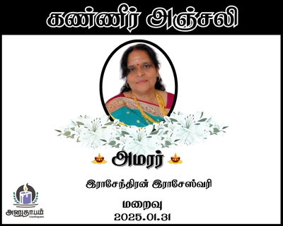அமரர் இராசேந்திரன் இராசேஸ்வரி மறைவு 31.01.2026 Share Post Facebook Twitter LinkedIn Pinterest Save Submit Review உங்கள் இரங்கலை தெரிவிக்க - “அமரர் இராசேந்திரன் இராசேஸ்வரி” Cancel reply அனுதாபம் துக்கம் கருணை பச்சாத்தாபம் Save my name, email, and website in this browser for the next time I comment. Drop images to upload or Gallery Images உங்கள் இரங்கலை தெரிவிக்க - “அமரர் இராசேந்திரன் இராசேஸ்வரி” Cancel reply அனுதாபம் துக்கம் கருணை பச்சாத்தாபம் Save my name, email, and website in this browser for the next time I comment. Drop images to upload or Gallery Images