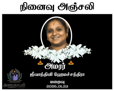 அமரர் ஜீவாந்தினி ஹேமச்சந்திரா 23.02.2026 Share Post Facebook Twitter LinkedIn Pinterest Save Submit Review உங்கள் இரங்கலை தெரிவிக்க - “அமரர் ஜீவாந்தினி ஹேமச்சந்திரா” Cancel reply அனுதாபம் துக்கம் கருணை பச்சாத்தாபம் Save my name, email, and website in this browser for the next time I comment. Drop images to upload or Gallery Images உங்கள் இரங்கலை தெரிவிக்க - “அமரர் ஜீவாந்தினி ஹேமச்சந்திரா” Cancel reply அனுதாபம் துக்கம் கருணை பச்சாத்தாபம் Save my name, email, and website in this browser for the next time I comment. Drop images to upload or Gallery Images