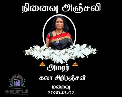 அமரர் கலா சிறிரஞ்சன் 09.01.2025 Jaffna Share Post Facebook Twitter LinkedIn Pinterest Save Submit Review உங்கள் இரங்கலை தெரிவிக்க - “அமரர் கலா சிறிரஞ்சன்” Cancel reply அனுதாபம் துக்கம் கருணை பச்சாத்தாபம் Save my name, email, and website in this browser for the next time I comment. Drop images to upload or Gallery Images உங்கள் இரங்கலை தெரிவிக்க - “அமரர் கலா சிறிரஞ்சன்” Cancel reply அனுதாபம் துக்கம் கருணை பச்சாத்தாபம் Save my name, email, and website in this browser for the next time I comment. Drop images to upload or Gallery Images