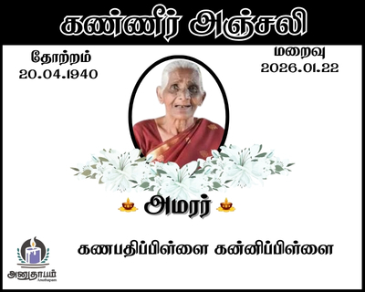 அமரர் கணபதிப்பிள்ளை கன்னிப்பிள்ளை தோற்றம் 20.04.1940 மறைவு 22.01.2026 Share Post Facebook Twitter LinkedIn Pinterest Save Submit Review உங்கள் இரங்கலை தெரிவிக்க - “அமரர் கணபதிப்பிள்ளை கன்னிப்பிள்ளை” Cancel reply அனுதாபம் துக்கம் கருணை பச்சாத்தாபம் Save my name, email, and website in this browser for the next time I comment. Drop images to upload or Gallery Images உங்கள் இரங்கலை தெரிவிக்க - “அமரர் கணபதிப்பிள்ளை கன்னிப்பிள்ளை” Cancel reply அனுதாபம் துக்கம் கருணை பச்சாத்தாபம் Save my name, email, and website in this browser for the next time I comment. Drop images to upload or Gallery Images