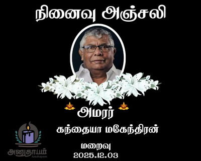 அமரர் கந்தையா மகேந்திரன் மறைவு 03.01.2025 CH Share Post Facebook Twitter LinkedIn Pinterest Save Submit Review உங்கள் இரங்கலை தெரிவிக்க - “அமரர் கந்தையா மகேந்திரன்” Cancel reply அனுதாபம் துக்கம் கருணை பச்சாத்தாபம் Save my name, email, and website in this browser for the next time I comment. Drop images to upload or Gallery Images உங்கள் இரங்கலை தெரிவிக்க - “அமரர் கந்தையா மகேந்திரன்” Cancel reply அனுதாபம் துக்கம் கருணை பச்சாத்தாபம் Save my name, email, and website in this browser for the next time I comment. Drop images to upload or Gallery Images