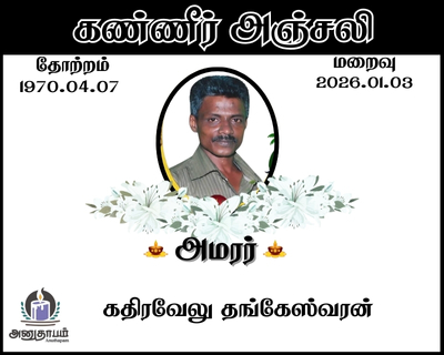 அமரர் கதிரவேலு தங்கேஸ்வரன் தோற்றம் 07.14.1970 மறைவு 03.01.2026 Kilinochchi Share Post Facebook Twitter LinkedIn Pinterest Save Submit Review உங்கள் இரங்கலை தெரிவிக்க - “அமரர் கதிரவேலு தங்கேஸ்வரன்” Cancel reply அனுதாபம் துக்கம் கருணை பச்சாத்தாபம் Save my name, email, and website in this browser for the next time I comment. Drop images to upload or Gallery Images உங்கள் இரங்கலை தெரிவிக்க - “அமரர் கதிரவேலு தங்கேஸ்வரன்” Cancel reply அனுதாபம் துக்கம் கருணை பச்சாத்தாபம் Save my name, email, and website in this browser for the next time I comment. Drop images to upload or Gallery Images