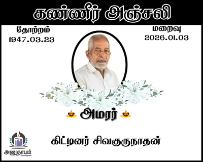 அமரர் கிட்டினர் சிவகுருநாதன் தோற்றம் 23.03.1947 மறைவு 03.01.2026 Share Post Facebook Twitter LinkedIn Pinterest Save Submit Review உங்கள் இரங்கலை தெரிவிக்க - “அமரர் கிட்டினர் சிவகுருநாதன்” Cancel reply அனுதாபம் துக்கம் கருணை பச்சாத்தாபம் Save my name, email, and website in this browser for the next time I comment. Drop images to upload or Gallery Images உங்கள் இரங்கலை தெரிவிக்க - “அமரர் கிட்டினர் சிவகுருநாதன்” Cancel reply அனுதாபம் துக்கம் கருணை பச்சாத்தாபம் Save my name, email, and website in this browser for the next time I comment. Drop images to upload or Gallery Images