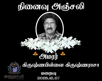 அமரர் கிருஷ்ணபிள்ளை கிருஷ்ணராசா 06.01.2025 Jaffna Share Post Facebook Twitter LinkedIn Pinterest Save Submit Review உங்கள் இரங்கலை தெரிவிக்க - “அமரர் கிருஷ்ணபிள்ளை கிருஷ்ணராசா” Cancel reply அனுதாபம் துக்கம் கருணை பச்சாத்தாபம் Save my name, email, and website in this browser for the next time I comment. Drop images to upload or Gallery Images உங்கள் இரங்கலை தெரிவிக்க - “அமரர் கிருஷ்ணபிள்ளை கிருஷ்ணராசா” Cancel reply அனுதாபம் துக்கம் கருணை பச்சாத்தாபம் Save my name, email, and website in this browser for the next time I comment. Drop images to upload or Gallery Images