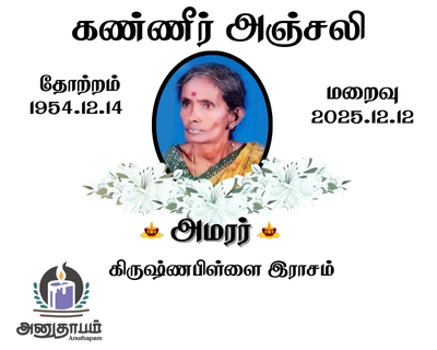 அமரர் கிருஷ்ணபிள்ளை இராசம் தோற்றம் 14.12.1954 மறைவு 12.12.2025 Jaffna Share Post Facebook Twitter LinkedIn Pinterest Save Submit Review உங்கள் இரங்கலை தெரிவிக்க - “அமரர் கிருஷ்ணபிள்ளை இராசம்” Cancel reply அனுதாபம் துக்கம் கருணை பச்சாத்தாபம் Save my name, email, and website in this browser for the next time I comment. Drop images to upload or Gallery Images உங்கள் இரங்கலை தெரிவிக்க - “அமரர் கிருஷ்ணபிள்ளை இராசம்” Cancel reply அனுதாபம் துக்கம் கருணை பச்சாத்தாபம் Save my name, email, and website in this browser for the next time I comment. Drop images to upload or Gallery Images