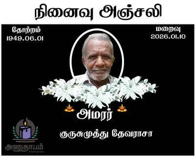 அமரர் குருசுமுத்து தேவராசா 17.02.2026 Share Post Facebook Twitter LinkedIn Pinterest Save Submit Review உங்கள் இரங்கலை தெரிவிக்க - “அமரர் குருசுமுத்து தேவராசா” Cancel reply அனுதாபம் துக்கம் கருணை பச்சாத்தாபம் Save my name, email, and website in this browser for the next time I comment. Drop images to upload or Gallery Images உங்கள் இரங்கலை தெரிவிக்க - “அமரர் குருசுமுத்து தேவராசா” Cancel reply அனுதாபம் துக்கம் கருணை பச்சாத்தாபம் Save my name, email, and website in this browser for the next time I comment. Drop images to upload or Gallery Images