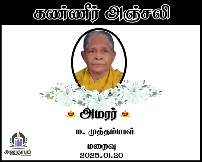 அமரர் ம. முத்தம்மாள் மறைவு 20.01.2026 Share Post Facebook Twitter LinkedIn Pinterest Save Submit Review உங்கள் இரங்கலை தெரிவிக்க - “அமரர் ம. முத்தம்மாள்” Cancel reply அனுதாபம் துக்கம் கருணை பச்சாத்தாபம் Save my name, email, and website in this browser for the next time I comment. Drop images to upload or Gallery Images உங்கள் இரங்கலை தெரிவிக்க - “அமரர் ம. முத்தம்மாள்” Cancel reply அனுதாபம் துக்கம் கருணை பச்சாத்தாபம் Save my name, email, and website in this browser for the next time I comment. Drop images to upload or Gallery Images