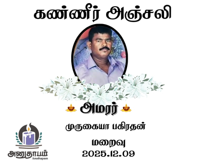 அமரர் முருகையா பகிரதன் தோற்றம் 26.11.1977 மறைவு 09.12.2025 KALMADU Share Post Facebook Twitter LinkedIn Pinterest Save Submit Review உங்கள் இரங்கலை தெரிவிக்க - “அமரர் முருகையா பகிரதன்” Cancel reply அனுதாபம் துக்கம் கருணை பச்சாத்தாபம் Save my name, email, and website in this browser for the next time I comment. Drop images to upload or Gallery Images உங்கள் இரங்கலை தெரிவிக்க - “அமரர் முருகையா பகிரதன்” Cancel reply அனுதாபம் துக்கம் கருணை பச்சாத்தாபம் Save my name, email, and website in this browser for the next time I comment. Drop images to upload or Gallery Images