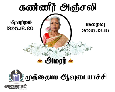 அமரர் முத்தையா ஆவுடையாச்சி தோற்றம் 20.12.1955 மறைவு 19.12.2025 Kilinochchi Share Post Facebook Twitter LinkedIn Pinterest Save Submit Review உங்கள் இரங்கலை தெரிவிக்க - “அமரர் முத்தையா ஆவுடையாச்சி” Cancel reply அனுதாபம் துக்கம் கருணை பச்சாத்தாபம் Save my name, email, and website in this browser for the next time I comment. Drop images to upload or Gallery Images உங்கள் இரங்கலை தெரிவிக்க - “அமரர் முத்தையா ஆவுடையாச்சி” Cancel reply அனுதாபம் துக்கம் கருணை பச்சாத்தாபம் Save my name, email, and website in this browser for the next time I comment. Drop images to upload or Gallery Images