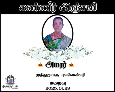 அமரர் முத்துகுமாரு புவனேஸ்வரி மறைவு 26.01.2026 Share Post Facebook Twitter LinkedIn Pinterest Save Submit Review உங்கள் இரங்கலை தெரிவிக்க - “அமரர் முத்துகுமாரு புவனேஸ்வரி” Cancel reply அனுதாபம் துக்கம் கருணை பச்சாத்தாபம் Save my name, email, and website in this browser for the next time I comment. Drop images to upload or Gallery Images உங்கள் இரங்கலை தெரிவிக்க - “அமரர் முத்துகுமாரு புவனேஸ்வரி” Cancel reply அனுதாபம் துக்கம் கருணை பச்சாத்தாபம் Save my name, email, and website in this browser for the next time I comment. Drop images to upload or Gallery Images