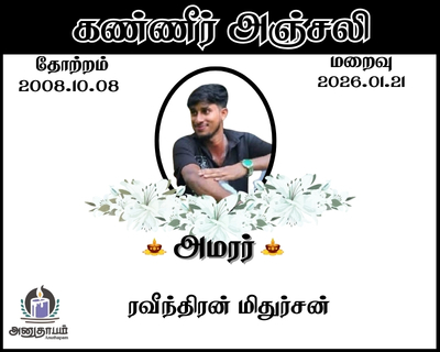 அமரர் ரவீந்திரன் மிதுர்சன் தோற்றம் 08.10.2008 மறைவு 21.01.2026 Jaffna Share Post Facebook Twitter LinkedIn Pinterest Save Submit Review உங்கள் இரங்கலை தெரிவிக்க - “அமரர் ரவீந்திரன் மிதுர்சன்” Cancel reply அனுதாபம் துக்கம் கருணை பச்சாத்தாபம் Save my name, email, and website in this browser for the next time I comment. Drop images to upload or Gallery Images உங்கள் இரங்கலை தெரிவிக்க - “அமரர் ரவீந்திரன் மிதுர்சன்” Cancel reply அனுதாபம் துக்கம் கருணை பச்சாத்தாபம் Save my name, email, and website in this browser for the next time I comment. Drop images to upload or Gallery Images