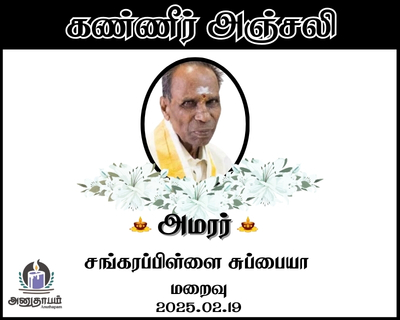 அமரர் சங்கரப்பிள்ளை சுப்பையா மறைவு 19.02.2026 Jaffna Share Post Facebook Twitter LinkedIn Pinterest Save Submit Review உங்கள் இரங்கலை தெரிவிக்க - “அமரர் சங்கரப்பிள்ளை சுப்பையா” Cancel reply அனுதாபம் துக்கம் கருணை பச்சாத்தாபம் Save my name, email, and website in this browser for the next time I comment. Drop images to upload or Gallery Images உங்கள் இரங்கலை தெரிவிக்க - “அமரர் சங்கரப்பிள்ளை சுப்பையா” Cancel reply அனுதாபம் துக்கம் கருணை பச்சாத்தாபம் Save my name, email, and website in this browser for the next time I comment. Drop images to upload or Gallery Images