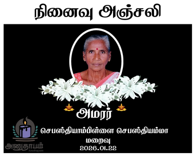 அமரர் செபஸ்தியாம்பிள்ளை செபஸ்தியம்மா 22.02.2026 Share Post Facebook Twitter LinkedIn Pinterest Save Submit Review உங்கள் இரங்கலை தெரிவிக்க - “அமரர் செபஸ்தியாம்பிள்ளை செபஸ்தியம்மா” Cancel reply அனுதாபம் துக்கம் கருணை பச்சாத்தாபம் Save my name, email, and website in this browser for the next time I comment. Drop images to upload or Gallery Images உங்கள் இரங்கலை தெரிவிக்க - “அமரர் செபஸ்தியாம்பிள்ளை செபஸ்தியம்மா” Cancel reply அனுதாபம் துக்கம் கருணை பச்சாத்தாபம் Save my name, email, and website in this browser for the next time I comment. Drop images to upload or Gallery Images