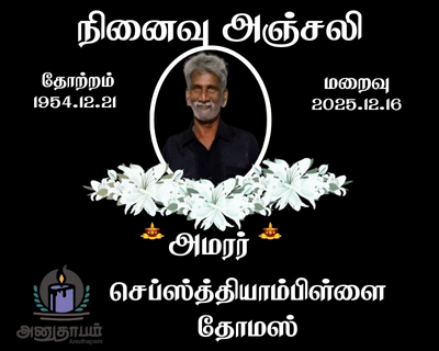 அமரர் செப்ஸ்த்தியாம்பிள்ளை தோமஸ் 16.01.2025 Share Post Facebook Twitter LinkedIn Pinterest Save Submit Review உங்கள் இரங்கலை தெரிவிக்க - “அமரர் செப்ஸ்த்தியாம்பிள்ளை தோமஸ்” Cancel reply அனுதாபம் துக்கம் கருணை பச்சாத்தாபம் Save my name, email, and website in this browser for the next time I comment. Drop images to upload or Gallery Images உங்கள் இரங்கலை தெரிவிக்க - “அமரர் செப்ஸ்த்தியாம்பிள்ளை தோமஸ்” Cancel reply அனுதாபம் துக்கம் கருணை பச்சாத்தாபம் Save my name, email, and website in this browser for the next time I comment. Drop images to upload or Gallery Images