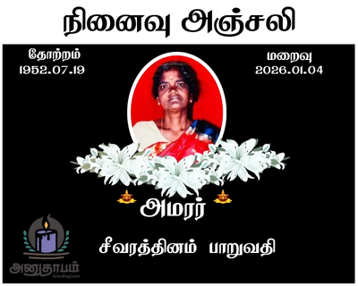 அமரர் சீவரத்தினம் பாறுவதி 04.02.2026 Share Post Facebook Twitter LinkedIn Pinterest Save Submit Review உங்கள் இரங்கலை தெரிவிக்க - “அமரர் சீவரத்தினம் பாறுவதி” Cancel reply அனுதாபம் துக்கம் கருணை பச்சாத்தாபம் Save my name, email, and website in this browser for the next time I comment. Drop images to upload or Gallery Images உங்கள் இரங்கலை தெரிவிக்க - “அமரர் சீவரத்தினம் பாறுவதி” Cancel reply அனுதாபம் துக்கம் கருணை பச்சாத்தாபம் Save my name, email, and website in this browser for the next time I comment. Drop images to upload or Gallery Images