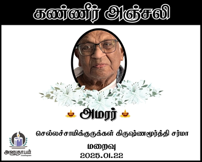 அமரர் செல்லச்சாமிக்குருக்கள் கிருஷ்ணமூர்த்தி சர்மா மறைவு 22.01.2026 Share Post Facebook Twitter LinkedIn Pinterest Save Submit Review உங்கள் இரங்கலை தெரிவிக்க - “அமரர் செல்லச்சாமிக்குருக்கள் கிருஷ்ணமூர்த்தி சர்மா” Cancel reply அனுதாபம் துக்கம் கருணை பச்சாத்தாபம் Save my name, email, and website in this browser for the next time I comment. Drop images to upload or Gallery Images உங்கள் இரங்கலை தெரிவிக்க - “அமரர் செல்லச்சாமிக்குருக்கள் கிருஷ்ணமூர்த்தி சர்மா” Cancel reply அனுதாபம் துக்கம் கருணை பச்சாத்தாபம் Save my name, email, and website in this browser for the next time I comment. Drop images to upload or Gallery Images