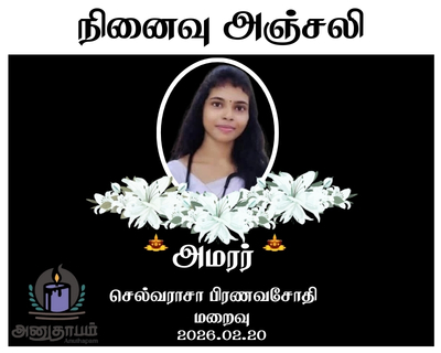அமரர் செல்வராசா பிரணவசோதி 20.03.2026 Batticaloa Share Post Facebook Twitter LinkedIn Pinterest Save Submit Review உங்கள் இரங்கலை தெரிவிக்க - “அமரர் செல்வராசா பிரணவசோதி” Cancel reply அனுதாபம் துக்கம் கருணை பச்சாத்தாபம் Save my name, email, and website in this browser for the next time I comment. Drop images to upload or Gallery Images உங்கள் இரங்கலை தெரிவிக்க - “அமரர் செல்வராசா பிரணவசோதி” Cancel reply அனுதாபம் துக்கம் கருணை பச்சாத்தாபம் Save my name, email, and website in this browser for the next time I comment. Drop images to upload or Gallery Images