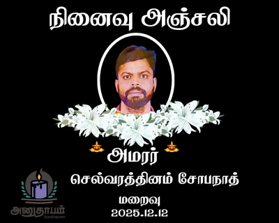 அமரர் செல்வரத்தினம் சோபநாத் Kilinochchi Share Post Facebook Twitter LinkedIn Pinterest Save Submit Review உங்கள் இரங்கலை தெரிவிக்க - “அமரர் செல்வரத்தினம் சோபநாத்” Cancel reply அனுதாபம் துக்கம் கருணை பச்சாத்தாபம் Save my name, email, and website in this browser for the next time I comment. Drop images to upload or Gallery Images உங்கள் இரங்கலை தெரிவிக்க - “அமரர் செல்வரத்தினம் சோபநாத்” Cancel reply அனுதாபம் துக்கம் கருணை பச்சாத்தாபம் Save my name, email, and website in this browser for the next time I comment. Drop images to upload or Gallery Images
