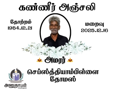 அமரர் செப்ஸ்த்தியாம்பிள்ளை தோமஸ் தோற்றம் 21.12.1954மறைவு 16.12.2025 Share Post Facebook Twitter LinkedIn Pinterest Save Submit Review உங்கள் இரங்கலை தெரிவிக்க - “அமரர் செப்ஸ்த்தியாம்பிள்ளை தோமஸ்” Cancel reply அனுதாபம் துக்கம் கருணை பச்சாத்தாபம் Save my name, email, and website in this browser for the next time I comment. Drop images to upload or Gallery Images உங்கள் இரங்கலை தெரிவிக்க - “அமரர் செப்ஸ்த்தியாம்பிள்ளை தோமஸ்” Cancel reply அனுதாபம் துக்கம் கருணை பச்சாத்தாபம் Save my name, email, and website in this browser for the next time I comment. Drop images to upload or Gallery Images