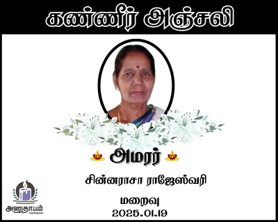 அமரர் சின்னராசா ராஜேஸ்வரி தோற்றம் 09.08.1944 மறைவு 20.01.2026 Share Post Facebook Twitter LinkedIn Pinterest Save Submit Review உங்கள் இரங்கலை தெரிவிக்க - “அமரர் சின்னராசா ராஜேஸ்வரி” Cancel reply அனுதாபம் துக்கம் கருணை பச்சாத்தாபம் Save my name, email, and website in this browser for the next time I comment. Drop images to upload or Gallery Images உங்கள் இரங்கலை தெரிவிக்க - “அமரர் சின்னராசா ராஜேஸ்வரி” Cancel reply அனுதாபம் துக்கம் கருணை பச்சாத்தாபம் Save my name, email, and website in this browser for the next time I comment. Drop images to upload or Gallery Images