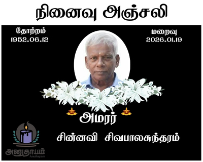 அமரர் சின்னவி சிவபாலசுந்தரம் 19.02.2026 Share Post Facebook Twitter LinkedIn Pinterest Save Submit Review உங்கள் இரங்கலை தெரிவிக்க - “அமரர் சின்னவி சிவபாலசுந்தரம்” Cancel reply அனுதாபம் துக்கம் கருணை பச்சாத்தாபம் Save my name, email, and website in this browser for the next time I comment. Drop images to upload or Gallery Images உங்கள் இரங்கலை தெரிவிக்க - “அமரர் சின்னவி சிவபாலசுந்தரம்” Cancel reply அனுதாபம் துக்கம் கருணை பச்சாத்தாபம் Save my name, email, and website in this browser for the next time I comment. Drop images to upload or Gallery Images