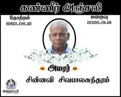 அமரர் சின்னவி சிவபாலசுந்தரம் தோற்றம் 12.06.1952 மறைவு 19.01.2026 Share Post Facebook Twitter LinkedIn Pinterest Save Submit Review உங்கள் இரங்கலை தெரிவிக்க - “அமரர் சின்னவி சிவபாலசுந்தரம்” Cancel reply அனுதாபம் துக்கம் கருணை பச்சாத்தாபம் Save my name, email, and website in this browser for the next time I comment. Drop images to upload or Gallery Images உங்கள் இரங்கலை தெரிவிக்க - “அமரர் சின்னவி சிவபாலசுந்தரம்” Cancel reply அனுதாபம் துக்கம் கருணை பச்சாத்தாபம் Save my name, email, and website in this browser for the next time I comment. Drop images to upload or Gallery Images