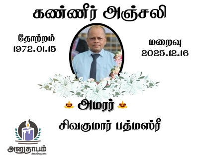அமரர் சிவகுமார் பத்மஸ்ரீ தோற்றம் 15. 01.1972மறைவு 16.12.2025 Share Post Facebook Twitter LinkedIn Pinterest Save Submit Review உங்கள் இரங்கலை தெரிவிக்க - “அமரர் சிவகுமார் பத்மஸ்ரீ” Cancel reply அனுதாபம் துக்கம் கருணை பச்சாத்தாபம் Save my name, email, and website in this browser for the next time I comment. Drop images to upload or Gallery Images உங்கள் இரங்கலை தெரிவிக்க - “அமரர் சிவகுமார் பத்மஸ்ரீ” Cancel reply அனுதாபம் துக்கம் கருணை பச்சாத்தாபம் Save my name, email, and website in this browser for the next time I comment. Drop images to upload or Gallery Images