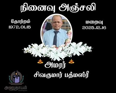 அமரர் சிவகுமார் பத்மஸ்ரீ 16.01.2025 Share Post Facebook Twitter LinkedIn Pinterest Save Submit Review உங்கள் இரங்கலை தெரிவிக்க - “அமரர் சிவகுமார் பத்மஸ்ரீ” Cancel reply அனுதாபம் துக்கம் கருணை பச்சாத்தாபம் Save my name, email, and website in this browser for the next time I comment. Drop images to upload or Gallery Images உங்கள் இரங்கலை தெரிவிக்க - “அமரர் சிவகுமார் பத்மஸ்ரீ” Cancel reply அனுதாபம் துக்கம் கருணை பச்சாத்தாபம் Save my name, email, and website in this browser for the next time I comment. Drop images to upload or Gallery Images