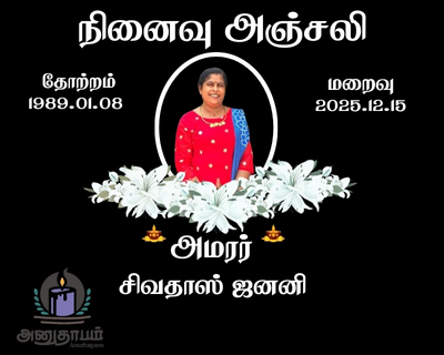 அமரர் சிவதாஸ் ஜனனி 15.01.2025 Jaffna Share Post Facebook Twitter LinkedIn Pinterest Save Submit Review உங்கள் இரங்கலை தெரிவிக்க - “அமரர் சிவதாஸ் ஜனனி” Cancel reply அனுதாபம் துக்கம் கருணை பச்சாத்தாபம் Save my name, email, and website in this browser for the next time I comment. Drop images to upload or Gallery Images உங்கள் இரங்கலை தெரிவிக்க - “அமரர் சிவதாஸ் ஜனனி” Cancel reply அனுதாபம் துக்கம் கருணை பச்சாத்தாபம் Save my name, email, and website in this browser for the next time I comment. Drop images to upload or Gallery Images