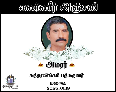 அமரர் சுந்தரலிங்கம் பத்மகுமார் மறைவு 19.01.2026 Jaffna Share Post Facebook Twitter LinkedIn Pinterest Save Submit Review உங்கள் இரங்கலை தெரிவிக்க - “அமரர் சுந்தரலிங்கம் பத்மகுமார்” Cancel reply அனுதாபம் துக்கம் கருணை பச்சாத்தாபம் Save my name, email, and website in this browser for the next time I comment. Drop images to upload or Gallery Images உங்கள் இரங்கலை தெரிவிக்க - “அமரர் சுந்தரலிங்கம் பத்மகுமார்” Cancel reply அனுதாபம் துக்கம் கருணை பச்சாத்தாபம் Save my name, email, and website in this browser for the next time I comment. Drop images to upload or Gallery Images