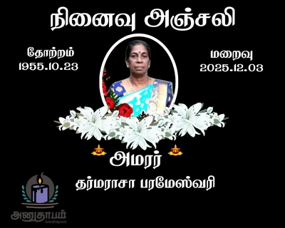 அமரர் தர்மராசா பரமேஸ்வரி தோற்றம் 23.10.1955 மறைவு 03.12.2025 SRI LANKA, Jaffna Share Post Facebook Twitter LinkedIn Pinterest Save Submit Review உங்கள் இரங்கலை தெரிவிக்க - “அமரர் தர்மராசா பரமேஸ்வரி” Cancel reply அனுதாபம் துக்கம் கருணை பச்சாத்தாபம் Save my name, email, and website in this browser for the next time I comment. Drop images to upload or Gallery Images உங்கள் இரங்கலை தெரிவிக்க - “அமரர் தர்மராசா பரமேஸ்வரி” Cancel reply அனுதாபம் துக்கம் கருணை பச்சாத்தாபம் Save my name, email, and website in this browser for the next time I comment. Drop images to upload or Gallery Images