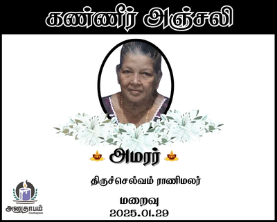 அமரர் திருச்செல்வம் ராணிமலர் மறைவு 29.01.2026 Share Post Facebook Twitter LinkedIn Pinterest Save Submit Review உங்கள் இரங்கலை தெரிவிக்க - “அமரர் திருச்செல்வம் ராணிமலர்” Cancel reply அனுதாபம் துக்கம் கருணை பச்சாத்தாபம் Save my name, email, and website in this browser for the next time I comment. Drop images to upload or Gallery Images உங்கள் இரங்கலை தெரிவிக்க - “அமரர் திருச்செல்வம் ராணிமலர்” Cancel reply அனுதாபம் துக்கம் கருணை பச்சாத்தாபம் Save my name, email, and website in this browser for the next time I comment. Drop images to upload or Gallery Images
