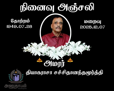 அமரர் தியாகராசா சச்சிதானந்தமூர்த்தி 07.01.2025 Jaffna Share Post Facebook Twitter LinkedIn Pinterest Save Submit Review உங்கள் இரங்கலை தெரிவிக்க - “அமரர் தியாகராசா சச்சிதானந்தமூர்த்தி” Cancel reply அனுதாபம் துக்கம் கருணை பச்சாத்தாபம் Save my name, email, and website in this browser for the next time I comment. Drop images to upload or Gallery Images உங்கள் இரங்கலை தெரிவிக்க - “அமரர் தியாகராசா சச்சிதானந்தமூர்த்தி” Cancel reply அனுதாபம் துக்கம் கருணை பச்சாத்தாபம் Save my name, email, and website in this browser for the next time I comment. Drop images to upload or Gallery Images