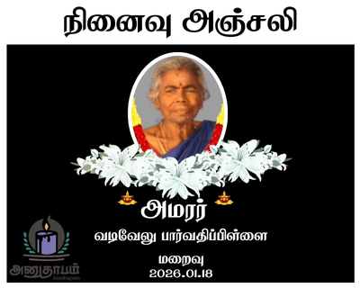 அமரர் வடிவேலு பார்வதிப்பிள்ளை 18.02.2026 Jaffna Share Post Facebook Twitter LinkedIn Pinterest Save Submit Review உங்கள் இரங்கலை தெரிவிக்க - “அமரர் வடிவேலு பார்வதிப்பிள்ளை” Cancel reply அனுதாபம் துக்கம் கருணை பச்சாத்தாபம் Save my name, email, and website in this browser for the next time I comment. Drop images to upload or Gallery Images உங்கள் இரங்கலை தெரிவிக்க - “அமரர் வடிவேலு பார்வதிப்பிள்ளை” Cancel reply அனுதாபம் துக்கம் கருணை பச்சாத்தாபம் Save my name, email, and website in this browser for the next time I comment. Drop images to upload or Gallery Images
