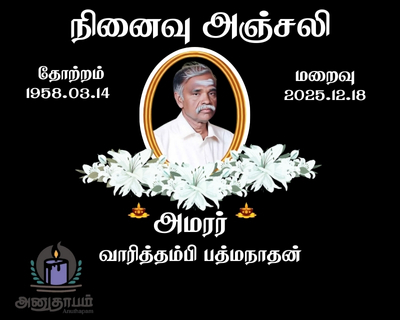 அமரர் வாரித்தம்பி பத்மநாதன் 18.01.2025 Share Post Facebook Twitter LinkedIn Pinterest Save Submit Review உங்கள் இரங்கலை தெரிவிக்க - “அமரர் வாரித்தம்பி பத்மநாதன்” Cancel reply அனுதாபம் துக்கம் கருணை பச்சாத்தாபம் Save my name, email, and website in this browser for the next time I comment. Drop images to upload or Gallery Images உங்கள் இரங்கலை தெரிவிக்க - “அமரர் வாரித்தம்பி பத்மநாதன்” Cancel reply அனுதாபம் துக்கம் கருணை பச்சாத்தாபம் Save my name, email, and website in this browser for the next time I comment. Drop images to upload or Gallery Images